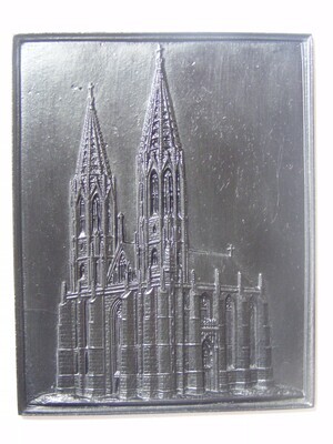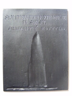 Sayner Neujahrsplakette für das Neujahr 1854 in Eisenguss geschwärzt. Dargestellt wird im Relief die Sankt Marienkirche zur Wiese in Soest. Der gotische Hallenbau St. Maria zur Wiese war Anfang des 14. Jahrhunderts, vermutlich 1313 über einem älteren Vorgängerbau errichtet worden. Der doppeltürmige Westbau wurde mit dem Aufbau des Nordturms 1421 begonnen. Die Türme wurden bis zur Höhe des Dachansatzes im Jahre 1529/30 weitergebaut. Erst in preußischer Zeit, also Mitte des 19. Jahrhunderts begannen Planungen zum weiteren Ausbau der Kirche. Die Sayner Naujahrsplakette von 1854 zeigt bereits die neu geplanten durchbrochenen Maßwerkhelme, die erst 1876 vollendet wurden. Das Modell erstellte Wilhelm Samuel Weigelt, Modelleur der Sayner Hütte. Die Plakette zeigt auf der Vorderseite keine Beschriftungen , stattdessen finden wir auf der Rückseite die Angaben "ST. MARIENKIRCHE ZUR WIESE IN SOEST. SAYNERHUTTE MDCCCLIV."