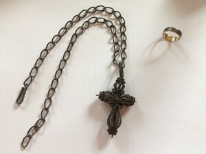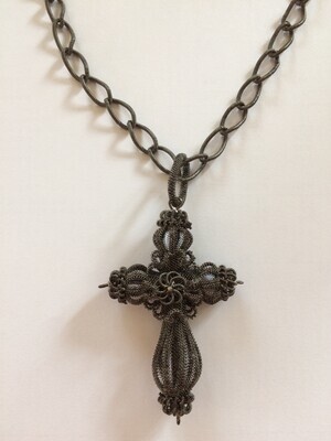Kollier mit kreuzförmigem Anhänger aus fein gewendeltem Stahldraht, ca. 1820.