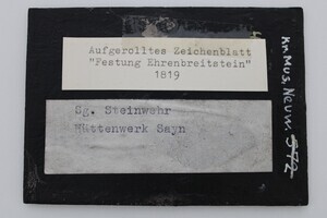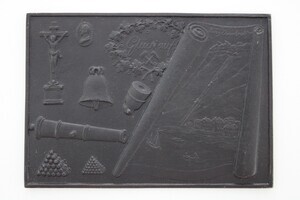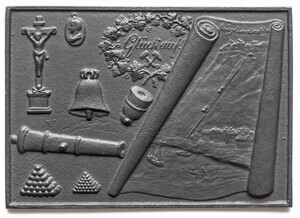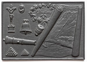 Sayner Neujahrsplakette für das Neujahr 1819 in Eisenguss geschwärzt. Es handelt sich um die erste Neujahrskarte, die die Sayner Hütte nach Einrichtung ihrer Tiegelgießerei (Kunstgießerei) herausgab. Das Relief zeigt die Produkte der Sayner Hütte. Rechts erkennt man eine aufgerollte Karte mit der Darstellung des Ehrenbreitsteiner Felsens und dem von der Sayner Hütte gegossenen, vom Rhein zur Feste führenden Schienenweg. Links befinden sich ein Altarkruzifix, ein Bildnismedaillon, eine Glocke, ein Mörser und ein Bergbausymbol mit zwei gekreuzten Hämmern und dem Gruß "Glück auf!". Der Entwurf der Neujahrsplakette stammt von Carl Osterwald, der Modelleur war Johann Heinrich Zumpft.