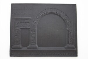 Sayner Neujahrsplakette für das Neujahr 1828 in Eisenguss geschwärzt. Das Modell erstellte Johann Heinrich Zumpft, Modelleur der Sayner Hütte. Die Plakette zeigt auf der Vorderseite unterhalb des Reliefs die Beschriftung "VORMALIGES PORTAL ZU REMAGEN AM RHEIN". Es handelt sich dabei um ein ist ein einmaliges Zeugnis mittelalterlicher Steinmetzkunst der Spätromanik (Ende12. Jahrhundert), das christliche und germanische Ikonographie vereint. Heute ist es Teil des Pfarrhoftores der katholischen Pfarrkirche St. Peter und Paul in Remagen. Über den ursprünglichen Standort der Anlage wie die ursprüngliche Anordnung der einzelnen Bauteile liegen leider keine gesicherten Erkenntnisse vor. Es existier ein Stahlstich von C. Collard aus der Zeit um 1850, mit dem Titel «VORMALIGES PORTAL DES PALASTEN SCONILARE ZU REMAGEN. Nach den Resten wieder dargestellt von B. Hundeshagen. MDCCCXXIV.» (1824). Die Entwurfszeichnung von Bernhard Hundshagen, einem Künstler aus Bonn, war auch Vorlage für das Modell der Neujahrsplakette der Sayner Hütte. Es existiert außerdem ein weiteres Modell für diese Neujahrskarte, bei der man dem Motiv einen Wanderer und als Hintergrund eine romantische Landschaft hinzugefügt hat (vgl. Roentgen 4609).