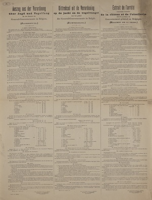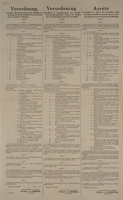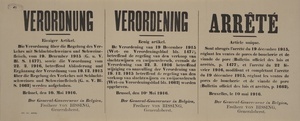 Wandanschlag in deutscher, niederländischer und französischer Sprache Herausgegeben vom General-Gouverneur des von Deutschland besetzten Belgiens, Freiherr von Bissing, am 10. Mai 1916 in Brüssel "Verordnung über die Erhöhung der Postgebühren für Briefe und Postkarten. Vom 1. Juni 1916 ab werden für die im Bereich des General-Gouvernements aufgelieferten [sic] und nach Orten im Bereich des General-Gouvernements bestimmten gebührenpflichtigen gewöhnlichen Briefe und Postkarten anstelle der bisherigen Sätze folgende Gebühren erhoben: Briefe (auch Kartenbriefe) bis 20 g. 15 c. für jede weiteren 20 g. 10 c. Postkarten, einfache 8 c. mit Antwortkarte 16 c. Hierzu tritt für eingeschriebene Briefe und Postkarten die Einschreibgebühr von 25 c. Bei unzureichend oder nicht freigemachten Briefen und Postkarten wird das Doppelte des Fehlbetrags, nötigenfalls unter Aufrundung auf eine durch 5 teilbare Summe, vom Empfänger eingezogen."