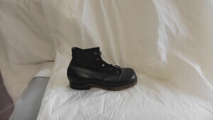 Ein Paar Schwarz-Rote Kinder-Stiefel aus Leder. Die Schuhe haben eine Eckige Form und einen Blockabsatz von 0,5 cm. Sie verfügen über eine Metallschnalle um die Verse und über Ziernähte. Datiert auf um 1955.