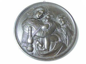Medaillon in Eisenguss geschwärzt, das im Relief die Darstellung der Madonna della Sedia nach einem Gemälde des italienischen Malers Raphael (1513/14) im Palazzo Pitti in Florenz zeigt. Als Vorlage für das Modell von Leonhard Posch für das Eisengussmedaillon aus der Zeit um 1820, das in allen drei königlich-preußischen Eisengießereien (Gleiwitz, Berlin und Sayn) hergestellt wurde, diente ein Stich von Raphael Morghen. Das Medaillon verfügt über einen Drahtaufhänger und zeigt auf der Rückseite erhaben mitgegossen die Gießereimarke der Sayner Hütte "S.H."
