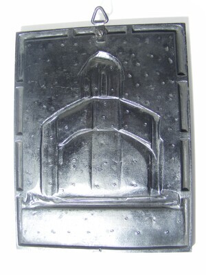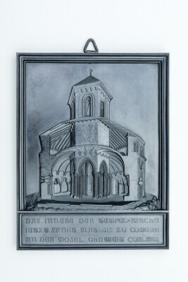 Eisengussrelief geschwärzt bzw. lackiert mit Ansicht der Matthiaskapelle in Kobern-Gondorf (Mosel) von innen. Unterhalb des Reliefs ist in einem rechteckigen Feld folgende Beschriftung zu finden: "DAS INNERE DER TEMPEL=KIRCHE IETZT SANKT MATHIAS ZU COBERN AN DER MOSEL OHNWEIT COBLENZ." Das Modell wurde wahrscheinlich von Wilhelm Samuel Weigelt auf der Sayner Hütte erstellt. Das Relief verfügt über einen mit gegossenen Rahmen und eine triangelförmige massive Aufhängeöse, die auf der Rückseite mit einer Niete mit halbkugeligem Kopf befestigt wurde. Ähnlich gestaltet und in derselben Größe existiert ein weiteres Relief, das die Außenansicht der Kapelle zeigt (vgl. F-REM 027). Letztere ist so auch auf der Neujahrsplakette der Sayner Hütte für das Neujahr 1845 nur verkleinert abgebildet.