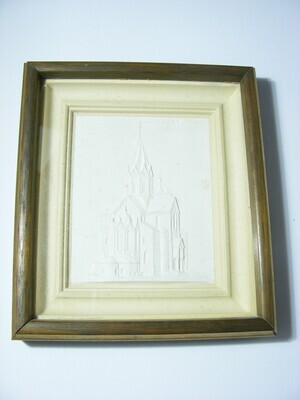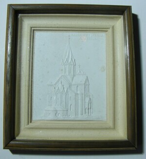 Sayner Neujahrsplakette für das Neujahr 1851 in Gips gegossen und gerahmt mit Darstellung der Kirche in Werden an der Ruhr im Relief. Neben Neujahrskarten in Eisenguss wurden auch kostengünstigere Gipsplaketten hergestellt.