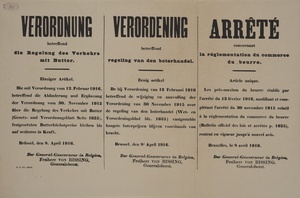 Wandanschlag in deutscher, niederländischer und französischer Sprache. Herausgegeben vom General-Gouverneur des von Deutschland besetzten Belgiens, Freiherr von Bissing, am 29. Januar 1916 in Brüssel "Verordnung betreffend die Sicherstellung der Versorgung der belgischen Zivilbevölkerung mit Kartoffeln. Artikel 1. Es ist verboten, Kartoffeln an andere Tiere als an Schweine zu verfüttern. Die tägliche Kartoffelgabe ist auf höchstens drei kg für jedes abgesetzte Schwein zu bemessen. Artikel 2. Zur Verfütterung an Schweine dürfen nur kleine oder kranke, für den menschlichen Genuss nicht geeignete Kartoffeln verwendet werden. Artikel 3. Die Verwendung der Kartoffeln als Saatgut darf das Mass von 2000 kg für den Hektar nicht übersteigen. Artikel 4. Zuwiderhandlungen gegen die vorstehenden Bestimmungen werden mit Haft oder Gefängnis bis zu 1 Jahre oder mit Geldstrafe bis zu 10 000 M bestraft. Auf beide Strafarten kann nebeneinander erkannt werden. Artikel 5. Zuständig sind die deutschen Militärgerichte. [...] Verordnung betreffend die Höchstpreise für Kartoffeln. Artikel 1 In Abänderung des Artikel 1 der Verordnung vom 28. September 1915 (Gesetz- und Verordnungsblatt S. 1090) wird der Preis für 100 kg. inländischer Kartoffeln aus der Ernte 1915 beim Verkaufe durch den Erzeuger festgesetzt: bei den Sorten: Industrie, Boules, Krüger, Magnum bonum (Florenville-Virton): auf 11,- Franken Magnum bonum, König Eduard: 10,- Rote und Blaue, sowie bei den übrigen Sorten: 9,- Artikel 2. Die Höchstpreise (Artikel 1) sind für den ganzen Bereich des General-Gouvernements gleichmässig massgebend. Artikel 3. Die Verordnung vom 28. September 1915 (Gesetz- und Verordnungsblatt S. 1090) bleibt, insoweit nicht vorstehende Verordnung oder die Verordnung vom 17. Januar 1916 (Gesetz- und Verordnungsblatt S. 1325) anderweitige Bestimmungen treffen, aufrecht."