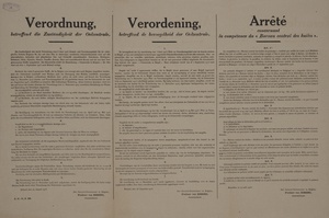 Wandanschlag in deutscher, niederländischer und französischer Sprache. Herausgegeben vom Generalgouverneur des von Deutschland besetzten Belgiens, Freiherr von Bissing, und der Oelzentrale in Belgien am 6. März 1916 in Brüssel "In Erläuterung der Verordnung, betreffend Verbot der Verwendung von Speiseölen und -fetten zu technischen Zwecken vom 26. Februar 1916 (Gesetz- und Verordnungsblatt für die okkupierten Gebiete Belgiens Nr. 184), wird Folgendes bekanntgegeben: Als pflanzliche und tierische Oele und Fette, die zum menschlichen Genusse geeignet sind, oder aus denen menschliche Genussmittel hergestellt werden können, gelten: Olivenöl, Leinöl, Rüböl, Mohnöl, Palmkernöl, Sesamöl, Erdnussöl, Baumwollsaatöl, Sonnenblumenöl, Walnussöl, Kakaobutter, Kokosnussbutter; Butter, Schmalz, Margarine, Premier Jus, Kunstspeisefett, Rinderfett, Hammeltalg, Schweinefett, Schmalzöl; ferner alle diejenigen pflanzlichen und tierischen Oele und Fette, die als Ersatz für die oben angeführten Arten bereits Verwendung finden. In allen Zweifelsfällen darüber, ob ein pflanzliches oder tierisches Oel oder Fett zum menschlichen Genusse taugt oder dafür brauchbar gemacht werden kann, entscheidet die Oelzentrale, an die sich die Besitzer derartigen Materials zu wenden haben. [...] Verordnung betreffend Bestandserhebung für elektrische Maschinen, Transformatoren und Apparate im Bereich des General-Gouvernements in Belgien."