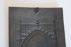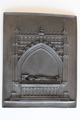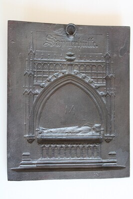 Sayner Neujahrsplakette in Eisenguss geschwärzt und herausgegeben für das Neujahr 1829. Dargestellt wird im Relief das Grabmal im gotischen Stil des Trierer Erzbischofs Kuno II. von Falkenstein in der Kastorkirche in Koblenz. Das beim Originalmonument vorhandene Gemälde der Kreuzigung in der Mitte wurde in dem Modell nicht umgesetzt. Die Plakette ist in sich leicht gebogen, weil sie vermutlich zu früh dem Formkasten entnommen wurde. Unterhalb des Reliefs ist auf der Vorderseite folgende Beschriftung zu lesen: "GRABMAL CUNO´S V. FALCKENSTEIN / IN DER KIRCHE ST. CASTOR ZU COBLENZ". Auf der Rückseite befindet sich unterhalb des Drahtaufhängers erhaben mit gegossen der Schriftzug "SAYNERHÜTTE" und in der Mitte die eingeritzte Zahl "14".