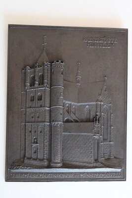 Sayner Neujahrsplakette in Eisenguss geschwärzt und herausgegeben für das Neujahr 1864. Das Modell stammt von Wilhelm Samuel Weigelt, Modelleur auf der Sayner Hütte. Dargestellt im Relief wird die St. Martinskirche in Münstermaifeld. Dabei hat man den Blick von Südwesten auf die ehemalige Stiftskirche mit dem Doppelpatrozinium St. Martin und St. Severus ausgewählt. Die dreischiffige Basilika mit weit ausladendem Querhaus verfügt über einen reich gegliederten Dreiapsidenchor im Osten und eine mächtige Turmgruppe im Westen. Die Vorderseite zeigt oben rechts die Beschriftung "SAYNERHÜTTE / MDCCCLXIV" und am unteren Rand "THURM d. ST. MARTINSKIRCHE zu MÜNSTERMAYFELD".