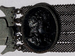 Armband bestehend aus 5 Streifen tüllartigem Stahldrahtgewebe besetzt mit 4 hochovalen Medaillons in Eisenguss, die Gemmen mit antiken Köpfen im Relief tragen. Die Gemmen sind eingefasst mit Perldraht. Bei dem ebenfalls hochovalen Verschlussstück mit Kastenschloss fehlt die Gemme. Die Stahlplatte der Gemmen ist nicht poliert und matt schwarz. Die antiken Köpf sind glänzend schwarz. Datierung: um 1820