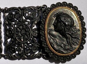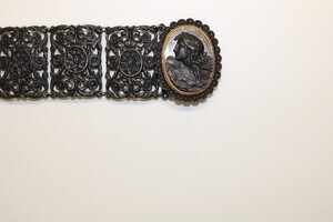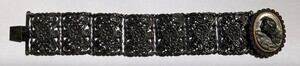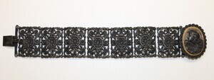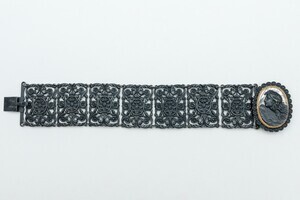 Achtteiliges durchbrochenes Gliederarmband mit hochovalem Verschlussstück und sieben gleichartigen, rechteckigen Gliedern, die durch kleine Ringe verbunden sind. Bei dem hochovalen Verschlussstück ist auf die polierte Stahlplatte ein Frauenkopfrelief mit wehendem Haar montiert und eingefasst mit vergoldetem Perldraht. Der Frauenkopf ist als Brustbild im Profil nach links blickend dargestellt (vgl. Forschler-Tarrasch, European Cast Iron, Kat.-Nr. 573). Das Armband wurde vermutlich in der Königlich-Preußischen Eisenhütte in Gleiwitz (polnisch Gliwice) gegossen. Wir kennen ein Armband mit vergleichbaren durchbrochenen Gliedern aus dem Museum in Gleiwitz (vgl. Anna Kwiecien, Zeliwo - Cast Iron, 2017, S. 284, Inv.-Nr. MGL/RA/2001). Datierung 1815-1820.