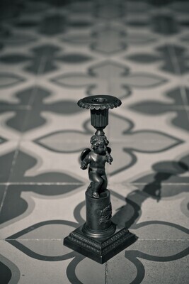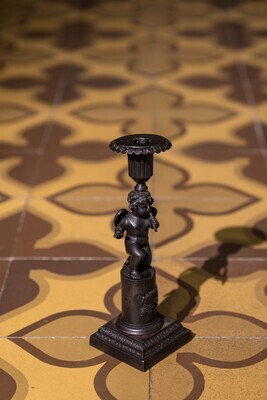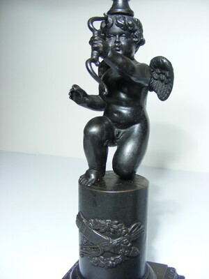 Zwei aus mehreren Eisengussteilen montierte kleine Kerzenleuchter bzw. Tafelleuchter mit auf einem Säulenstumpf knieendem Amor, der in seiner linken Hand einen Bogen hält. Auf dem Kopf des Amors ist der kreisrunde gerippte Kerzenhalter mit Tropfschutz befestigt. Auf der Vorderseite der Säule ist als Verzierung ein reliefierter Blütenkranz mit darüberliegendem Köcher mit Pfeilen genietet. Die Unterseite der Plinthe zeigt die Gießereimarke der Königlich-Preußischen Sayner Hütte "S.H.". Der Leuchter ist im Musterbuch der Sayner Hütte mit quadratischer und im Gleiwitzer Katalog mit runder Plinthe abgebildet. Datierung um 1820-1830.