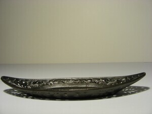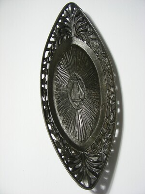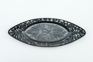 Lichtscherenteller nach einem Modell von Christoph Mendel gegossen in den Königlich-Preußischen Eisengießereien Gleiwitz, Berlin oder Sayn, um 1810. Diese spitzovale Schale hat einen durchbrochenen Rand und ist in der Mitte mit einer Lyra im Strahlenoval verziert. Das ursprüngliche Modell entstand auf der Gleiwitzer Hütte, wo Mendel nach 1802 tätig war. Neben den Schwesterbetrieben in Berlin und Sayn entstanden Kopien in den Eisengießereien Horowitz und Mariazell.