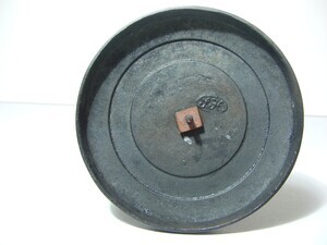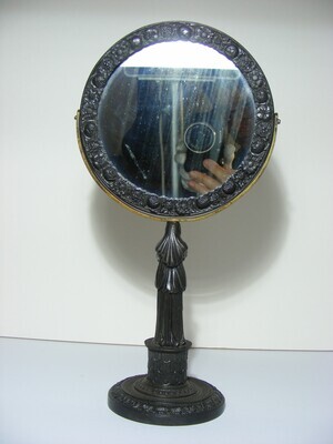 Tischspiegel aus Eisenguss. Der runde Spiegel zum Kippen ist mit einer Messinghalterung am Spiegelschaft befestigt. Unter der runden Plinthe bzw. Fußplatte ist erhaben mit gegossen die Gießereimarke der Sayner Hütte "S.H." Der Schaft des Spiegels wurde in Form einer weiblichen Figur in antiker Tracht mit gekreuzten Armen dargestellt. Der Spiegelrahmen ist mit Rosen und anderen Blumenblüten reliefiert. Der Kippspiegel ist im Musterbuch der Sayner Hütte abgebildet.