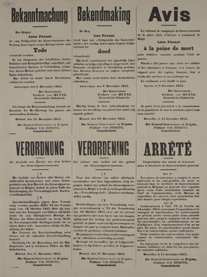 Wandanschlag in deutscher, niederländischer und französischer Sprache. Herausgegeben vom Generalgouverneur des von Deutschland besetzten Belgiens, Freiherr von Bissing, am 29. Januar 1916 in Brüssel "Durch Urteil eines Feldgerichts vom 12. 1. 16 bezw. 19. 1. 16 wurden nachbenannte Personen verurteilt: 1. Arbeiter Victor Marschandt aus Hoeylaert wegen vollendeten Kriegsverrats in Verbindung mit Waffenbeseitz und Wildern zu lebenslänglicher Zuchthausstrafe. 2. Landwirt Hippolyt Jans aus Lennick-St. Quentin wegen versuchten Kriegsverrats in Verbindung mit Waffenbesitz und Wildern zu 15 Jahren Zuchthaus. Beide Beschuldigte haben beim Wildern mit Gewehr und Karbidlaterne auf eine deutsche Militär-Patrouille geschossen. Marschandt hat dabei einen deutschen Unteroffizier schwer am Bein verletzt, während Jans keinen der deutschen Soldaten getroffen hat. Beide Verbrechen sind vor Bekanntbage der Verordnung des Gen. Gouv. gegen Bedrohung der öffentlichen Sicherheit vom 11. 1. 16 begangen worden. Nach dieser Verordnung kann in Zukunft das Schiessen auf deutsche Soldaten, auch wenn ein solcher nicht getroffen worden ist, mit dem Tode bestraft werden. Brüssel, den 25. Januar 1916. Der Militärgouverneur der Provinz Brabant, von Schröder, Generalmajor. - Ich bringe die Bekanntmachung hiermit zur Kenntnis der Bevölkerung des ganzen mit unterstellten Gebietes."
