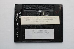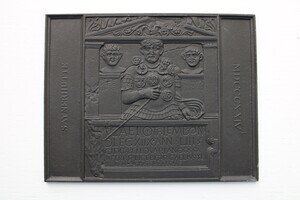 Sayner Neujahrsplakette für das Neujahr 1824 in Eisenguss geschwärzt. Dargestellt wird die Grabplatte des Centurio Marcus Caelius, ein römischer Offizier, der im Feldzug des Varus (Teutoburger Wald) fiel. Im oberen Teil ist der Hauptmann als Soldat (Halbfigur) mittig dargestellt. Rechts und Links davon befinden sich kleinere Kopfbilder auf Postamenten. Der Modelleur war Johann Heinrich Zumpft.