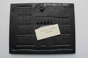Sayner Neujahrsplakette für das Neujahr 1822 in Eisenguss geschwärzt. Dargestellt wird die Porta Nigra in Trier, mit der Ansicht von Norden. Die Plakette zeigt den Zustand des Monuments nach der Entfernung der Doppelkirchenanlage. Die aus dem letzten Viertel des 2. Jahrhunderts n.Chr. stammende römische Toranlage war seit dem 11. Jahrhundert von dem angrenzenden Simeonstift als Kirchenanlage aus- und umgebaut worden ohne die römische Bausubstanz wesentlich zu verändern. Nach Einzug der französischen Revolutionstruppen wurde die Kirche demontiert. 1805 kam der Abbruch der mittelalterlichen Einbauten zum Erliegen, bis er 1815-1817 unter preußischer Regierung abgeschlossen und die Porta Nigra schließlich 1822 als Stadttor wieder eröffnet wurde.