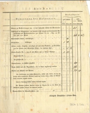 Beidseitig bedruckter Papierbogen mit dem Titel "Preis-Courant / der / Eisen-Guß-Waaren, / welche auf der Königlich-Preußischen Eisenhütte zu Sayn bei Ehrenbreitstein angefertigt werden, und für / beigesetzte Preise in Preuß. Courant auf der Hütte zu haben sind." Das Preis-Courant datiert vermutlich in die Zeit um 1815, vor Einführung der Produktion von Eisenkunstguss. Als Gusswaren werden auf den beiden Seiten folgende Produkte aufgelistet: Kessel, Kochgeschirr, Bratpfannen, Waffeleisen, Gitter-Tore und Türen, Ketten, Pferde-Raufen, Glocken. Dabei wird bei der Herstellung der Produkte zwischen sog. offenen Herdguss-Verfahren und dem sog. Kasten-Guss unterschieden auch der Lehmguss wird explizit erwähnt bei der Herstellung u.a. von Kesseln. Bei der Abnahme größerer mengen wird der Kundschaft angeboten die Waren kostenfrei an den Rhein bei Mülhofen zu liefern zwecks Weitertransport per Schiff.