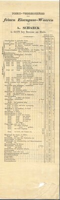 Beidseitig bedruckter schmaler Papierbogen betitelt mit "Preis-Verzeichnis der feinen Eisenguss-Waaren bei A. Schaeck in Sayn bey Bendorf am Rhein" aus den 1820er Jahren. Aufgelistet wird ein umfangreiches Verkaufsrepertoir an Eisenkunstgussobjekten aus der Produktion der Sayner Hütte. Dabei wird auf der Rückseite unter Bemerkungen vermerkt, dass nach einer Übereinkunft mit der Königlich-Preußischen Sayner Hütte alle in Gold, Silber, Stahl etc. gefassten Waren nur bei A. Schaeck in Sayn zu erhalten seien. Es handelt sich dabei vor allem um Eisenschmuck, der partiell vergoldet oder versilbert und teilweise auf polierte Stahlplättchen montiert wurde. A. Schaeck war Finanzverwalter des Grafen Boos von Waldeck in Sayn.