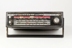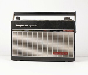 Der Telefunken Transistor Empfänger, Bajazzo Sport. wurde zwischen 1969 bis 1972 produziert. Er ist für den stationären, flexiblen und Autobetrieb konzipiert. Das schwarze Thermoplastgehäuse immitiert einen Lederbezug. Auf der Vorderseite ist der Lautsprecherbereich mit einer Aulminum Abdeckung versehen. Die Stromaufnahme erfolgt über 220 V (ext. Netzteil) oder 6 x 1,5 Volt Batterien bzw über den Anschluss Autobatterie. Im Bedienfeld an der Oberseite, fallen die großen Drucktasten auf, die der Wahl der Wellenbereiche, UKW/MW/LW KW dienen. Mit an Bord sind zwei extraTasten, mit denen sich vorgewählte MW-Sender fixieren lassen. Mit den Drehknöpfen werden die Sender und die Klangfarbe reguliert. Das Kofferradio kostete im Laden ca. 280 DM Die Anschlüsse für externe Geräte sind seitlich angeordnet. Dazu gehören Plattenspieler, Tonband, Zweitlautsprecher und Stromanschluss. Knapp 200 DM musste der Kunde für das Gerät bezahlen.