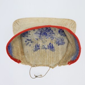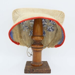 Trachtenhaube aus wohl ursprünglich weißem Leinen, jetzt beige verfärbt. Links ist mit gleichfarbigem Garn ein unauffälliges „M“ eingestickt. Deckel hinten und vorderer Rand der Krempe gitterartig durchbrochen, diese Stellen sind dunkelblau angemalt. Der Rand der Krempe ist mit einem roten Band eingefasst. Ein Schnittmuster für diese Haubenform ist hier hinterlegt: https://rlp.museum-digital.de/index.php?t=objekt&oges=77271