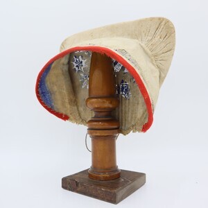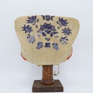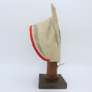 Trachtenhaube aus wohl ursprünglich weißem Leinen, jetzt beige verfärbt. Links ist mit gleichfarbigem Garn ein unauffälliges „M“ eingestickt. Deckel hinten und vorderer Rand der Krempe gitterartig durchbrochen, diese Stellen sind dunkelblau angemalt. Der Rand der Krempe ist mit einem roten Band eingefasst. Ein Schnittmuster für diese Haubenform ist hier hinterlegt: https://rlp.museum-digital.de/index.php?t=objekt&oges=77271