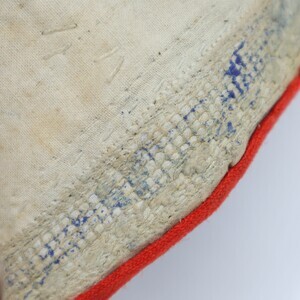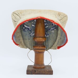 Trachtenhaube aus wohl ursprünglich weißem Leinen, jetzt beige verfärbt. Rechts ist mit gleichfarbigen Garn ein unauffälliges „M“ eingestickt, daneben ein Halbkreis in Dunkelbraun. Deckel hinten gitterartig durchbrochen, diese Stellen sind dunkelblau angemalt. Der Rand der Krempe ist mit einem roten Band eingefasst. Ein Schnittmuster für diese Haubenform ist hier hinterlegt: https://rlp.museum-digital.de/index.php?t=objekt&oges=77271