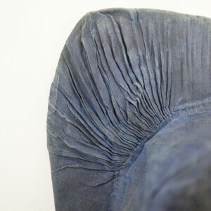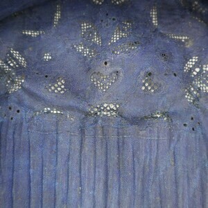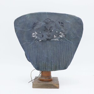Es handelt sich hierbei um eine sogenannte Löcherblauhaube aus dem Hunsrück. Die Trachtenhaube ist blau angemalt und besteht aus gesteiftem Leinen. Der Deckel ist gitterartig in einem symmetrischen Blütenmuster durchbrochen und mit Tambourstichen umstickt. Der Rand der Krempe ist ebenfalls durchbrochen. Dieser Stil stammt vermutlich aus Zell und ist Mischform einer Art des Hunsrücker "Kornetchen" (Form) und einer Art des Eifeler "Boak" (Durchstöße). Vermischungen dieser Art können entstehen wenn mehrere Familien umziehen und ihre Tracht teilweise der neuen Heimat anpassen, jedoch einzelne Aspekte ihrer vorherigen Regionaltracht auf die Neue übertragen. Ein Schnittmuster für diese Haubenform ist hier hinterlegt: https://rlp.museum-digital.de/index.php?t=objekt&oges=77271