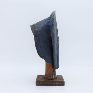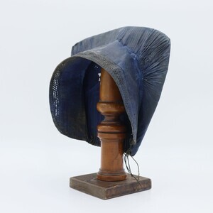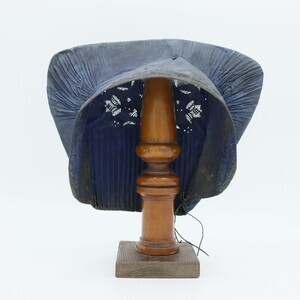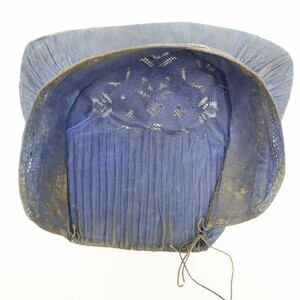 Es handelt sich hierbei um eine sogenannte Löcherblauhaube aus dem Hunsrück. Die Trachtenhaube ist blau angemalt und besteht aus gesteiftem Leinen. Der Deckel ist gitterartig in einem symmetrischen Blütenmuster durchbrochen und mit Tambourstichen umstickt. Der Rand der Krempe ist ebenfalls durchbrochen. Dieser Stil stammt vermutlich aus Zell und ist Mischform einer Art des Hunsrücker "Kornetchen" (Form) und einer Art des Eifeler "Boak" (Durchstöße). Vermischungen dieser Art können entstehen wenn mehrere Familien umziehen und ihre Tracht teilweise der neuen Heimat anpassen, jedoch einzelne Aspekte ihrer vorherigen Regionaltracht auf die Neue übertragen. Ein Schnittmuster für diese Haubenform ist hier hinterlegt: https://rlp.museum-digital.de/index.php?t=objekt&oges=77271