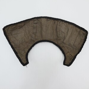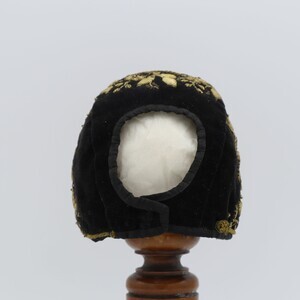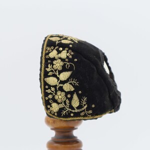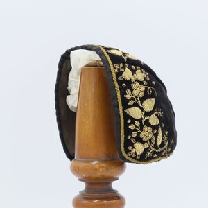 Diese winzige Kopfbedeckung ist aus schwarz- bis dunkelbraunem Samt gefertigt und mit goldenem Bouillon und Pailetten festlich in einem floralen Muster bestickt. Das Häubchen ist mit grobem Leinen in grau-braun gefüttert und besteht aus 3 Teilen die eine simple runde Form ergeben. Hinten befindet sich eine Aussparung unter der sich die beiden Seitenteile überlappen. Der Rand ist mit einem schlichten scharzen Band eingefasst, an der vorderen und unteren Kante wurde daneben eine dekorative goldene Kordel dazugefügt. Es handelt sich um eine sogenannte Ohreisenmütze/Haarflechtmütze (auf Platt "Urisenmötsch") der unteren Moselregion die ausschließlich von unverheirateten Frauen getragen wurde. Sie wird am Hinterkopf getragen, die geflochtenen Haare werden durch die Öffnung gezogen und als Knoten um den sogenannten "Tugendpfeil" (Trier auch als "Spieß" bekannt) aufgesteckt. Die Trageweise ist hier dargestellt: https://rlp.museum-digital.de/index.php?t=objekt&oges=114 Den Fotos ist ein Schnittmuster zugefügt.