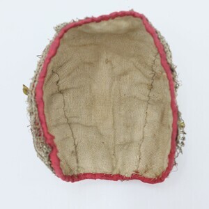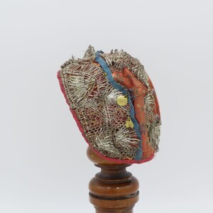 Dieses prunkvolle Häubchen ist aus feinem korallenorangenem Seidenjaquard mit Blumenmuster gefertigt. Als Dekoration wurden geköppelte Silberspitze, ein hellblaues Seidenband und winzige goldene Blechanhänger angebracht. Die Form ist sehr simpel, doch die reiche Dekoration lässt auf eine Funktion für besondere Anlässe schließen, wahrscheinlich eine Taufe. Die Babyhaube ist innen mit hellbraunem Leinen gefüttert und außenherum mit rosa Band eingefasst.