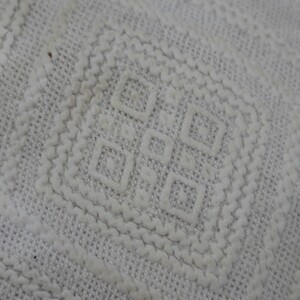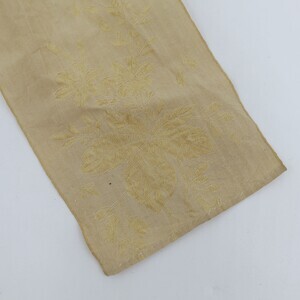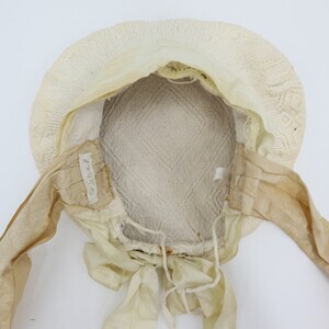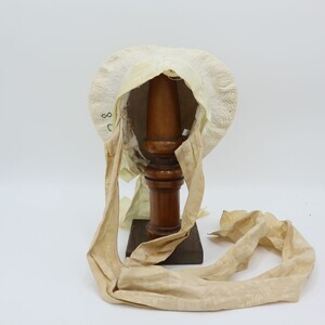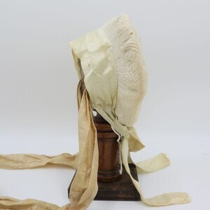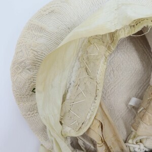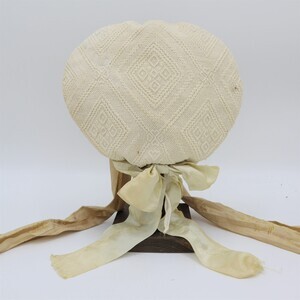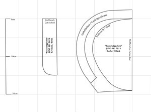 Es handelt sich hierbei um ein sogenanntes Rozzekäppchen, eine Art von Trachtenhaube die im Saargau verbreitet war. Das aus weißem Leinen gefertigte Käppchen wurde am Hinterkopf getragen und je nach Alter der Trägerin farblich unterschiedlich gestaltet. Erwachsene Frauen trugen aufgestickte und später aufgemalte schwarze Blumen, komplett weiße Hauben wie bei diesem Exemplar waren üblich für junge Mädchen. Links ist die Nummer "228" mit grünem Stickgarn eingestickt. Die Herstellung eines Rozzekäppchens verlief wie folgt: "Ein Stück Musselin wurde in der entsprechenden Größe geschnitten, dann begann genau in der Mitte das bietzen (Steppen) der Muddel (Musterung) und zwar ohne irgendeine Vorzeichnung. Das Zählen der Maschen des feinen Batistgewebes gab für das Muster den Anhalt. Letzteres besteht aus Streifen, welche den Stoff in rautenförmige Felder einteilte, und aus Blumen, welche die Mitte der Felder einrahmten. Die Streifen und Blumen entstanden dadurch, dass der Grund dicht mit Mustern bedeckt wurde, wodurch er niedergehalten wurde, während die Streifen und Blumen etwas erhaben standen. Die Streifen selbst wurden durch sogenannte "Irrgänge" belebt, die als "doppelte Irrgänge" (doppel) und als "einletzige Irrgänge" (einzelne) oder als "doppelte Irrgänge mit einletzigem Drumherum" gearbeitet waren. (...) War so der ganze (Boden) gesteppt, was oft 14 Tage in Anspruch nahm, dann wurde er an drei Seiten "eingeriehen", d.h. in kleine Falten zusammengezogen, dadurch erhielt man die Form; Dabei mussten sorgfältig alle "Belfen" (d. h. Kanten) vermieden werden. Nun wurde das "Vierscht" (d. h. der senkrecht stehende Teil) genäht und am "Boddem" befestigt. Darauf folgte die Arbeit des Waschen und Trocknens. Sodann bereitete man eine kräftige Stärke, und das Rozzekäppchen wurde damit "gepappt", d. h. gestärkt. Während es getrocknet wurde, schnitt man Paper (meist Zeitungen) in der Form des Boddems und klebte mehrere Blätter übereinander; Waren dann diese Blätter in das Innere des Rozzekäppchens befestigt, so wurde es mittels eines eigenen Bügeleisens gebügelt. Dabei wurden die rings um das Vierscht laufenden Falten des Boddems "rein gemacht", d.h. gleichmäßig gelegt. War die nötige Steife erreicht, dann wurden die Falten noch mit einem stumpfen Messer gerichtet. Nun faßte man das Vierscht an seinem unteren Ende mit einem schmalen Seidenband ein. Um das ganze Vierscht kam nun das breite blauseidene Band, das nach hinten zu einem "Schlopp" gebunden wurde. Schließlich wurden die beiden Bindbänder angenäht, die aus blumiger, gestreifter Seide (in verschiedenen Farben) bestanden." Ein fertiges Rozzekäppchen kostete 2 Taler, genauso viel wie ein gewöhnliches Frauenkleid." Dieses Käppchen weicht leicht von der Beschreibung ab, es ist nicht von innen mit Papier verstärkt, stattdessen wurde ein Stück Pappe am "Vierscht" angenäht das durch das darüber laufende Satinband verdeckt wird. Die Farbe des Schleifenbandes entspricht ebenfalls nicht der Beschreibung." Zitat aus Mitteilungen über Trachten, Hausrat, Wohn-und Lebensweise im Rheinland (Franz von Pelzer Berensberg) Den Fotos ist ein Schnittmuster zugefügt.