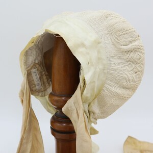 Es handelt sich hierbei um ein sogenanntes Rozzekäppchen, eine Art von Trachtenhaube die im Saargau verbreitet war. Das aus weißem Leinen gefertigte Käppchen wurde am Hinterkopf getragen und je nach Alter der Trägerin farblich unterschiedlich gestaltet. Erwachsene Frauen trugen aufgestickte und später aufgemalte schwarze Blumen, komplett weiße Hauben wie bei diesem Exemplar waren üblich für junge Mädchen. Links ist die Nummer "228" mit grünem Stickgarn eingestickt. Die Herstellung eines Rozzekäppchens verlief wie folgt: "Ein Stück Musselin wurde in der entsprechenden Größe geschnitten, dann begann genau in der Mitte das bietzen (Steppen) der Muddel (Musterung) und zwar ohne irgendeine Vorzeichnung. Das Zählen der Maschen des feinen Batistgewebes gab für das Muster den Anhalt. Letzteres besteht aus Streifen, welche den Stoff in rautenförmige Felder einteilte, und aus Blumen, welche die Mitte der Felder einrahmten. Die Streifen und Blumen entstanden dadurch, dass der Grund dicht mit Mustern bedeckt wurde, wodurch er niedergehalten wurde, während die Streifen und Blumen etwas erhaben standen. Die Streifen selbst wurden durch sogenannte "Irrgänge" belebt, die als "doppelte Irrgänge" (doppel) und als "einletzige Irrgänge" (einzelne) oder als "doppelte Irrgänge mit einletzigem Drumherum" gearbeitet waren. (...) War so der ganze (Boden) gesteppt, was oft 14 Tage in Anspruch nahm, dann wurde er an drei Seiten "eingeriehen", d.h. in kleine Falten zusammengezogen, dadurch erhielt man die Form; Dabei mussten sorgfältig alle "Belfen" (d. h. Kanten) vermieden werden. Nun wurde das "Vierscht" (d. h. der senkrecht stehende Teil) genäht und am "Boddem" befestigt. Darauf folgte die Arbeit des Waschen und Trocknens. Sodann bereitete man eine kräftige Stärke, und das Rozzekäppchen wurde damit "gepappt", d. h. gestärkt. Während es getrocknet wurde, schnitt man Paper (meist Zeitungen) in der Form des Boddems und klebte mehrere Blätter übereinander; Waren dann diese Blätter in das Innere des Rozzekäppchens befestigt, so wurde es mittels eines eigenen Bügeleisens gebügelt. Dabei wurden die rings um das Vierscht laufenden Falten des Boddems "rein gemacht", d.h. gleichmäßig gelegt. War die nötige Steife erreicht, dann wurden die Falten noch mit einem stumpfen Messer gerichtet. Nun faßte man das Vierscht an seinem unteren Ende mit einem schmalen Seidenband ein. Um das ganze Vierscht kam nun das breite blauseidene Band, das nach hinten zu einem "Schlopp" gebunden wurde. Schließlich wurden die beiden Bindbänder angenäht, die aus blumiger, gestreifter Seide (in verschiedenen Farben) bestanden." Ein fertiges Rozzekäppchen kostete 2 Taler, genauso viel wie ein gewöhnliches Frauenkleid." Dieses Käppchen weicht leicht von der Beschreibung ab, es ist nicht von innen mit Papier verstärkt, stattdessen wurde ein Stück Pappe am "Vierscht" angenäht das durch das darüber laufende Satinband verdeckt wird. Die Farbe des Schleifenbandes entspricht ebenfalls nicht der Beschreibung." Zitat aus Mitteilungen über Trachten, Hausrat, Wohn-und Lebensweise im Rheinland (Franz von Pelzer Berensberg) Den Fotos ist ein Schnittmuster zugefügt.