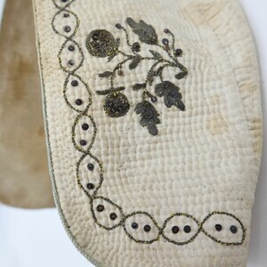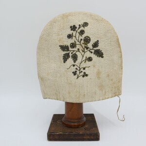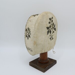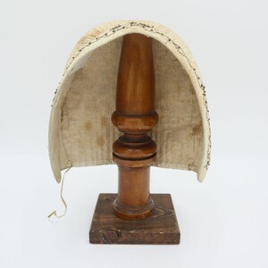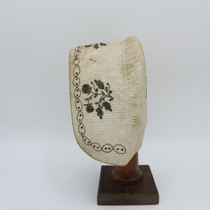 Hierbei handelt es sich um eine klassische "Boak" der Eifelregion (Bitburg/Daun/Prüm) mit goldener Stickerei aus Metallfaden (Plattstich, Tambour) und Pailletten. Die Haube besteht aus weißem Leinen das mit mit winzigen, in Reihen angeordneten Steppstichen wattiert wurde, am Rand sind die Stiche enger beieinander. Im Gegensatz zu anderen Exemplaren sind hier keine dekorativen Seidenbänder angebracht, diese wurden nur zu Sonn- und Festtagen hinzugefügt. Der vordere Rand der Haube wird durch einen grünlichen Paspel in Flechtstruktur abgeschlossen. Den Fotos ist ein Schnittmuster zugefügt.