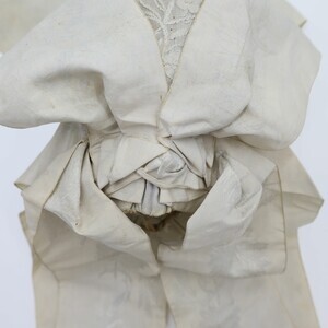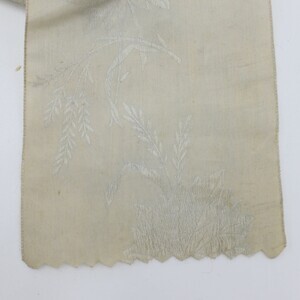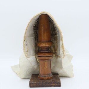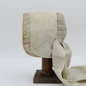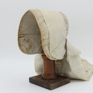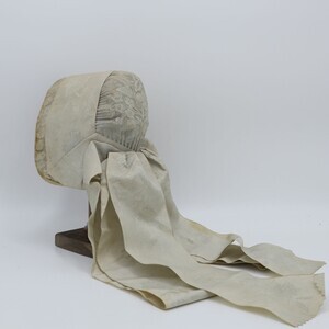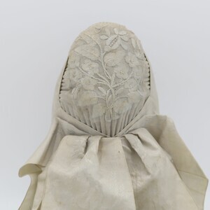 Trachtenhaube aus dünner feiner Baumwollein weiß. Der Deckel und Rand der Krempe sind mit Blüten und Blattornamenten und bestickt, die Flächen der Blüten und größeren Blätter erscheinen heller durch die Applikation einer zweiten Lage Baumwollstoff. Kleinere Blätter sind mit Füllstich gestaltet, Stängel aus Stielstichen verbinden die einzelnen Elemente. Um die Haube herum wurde ein gleichfarbiges Seidenband mit floralem Muster angebracht das hinten zusammenläuft und von dort in zwei Schlaufen und zwei Bändern herunterhängt. Der Rand der Krempe endet in einem naturfarbenen Paspel mit dekorativer Zopfborte in gleicher Farbe daneben. Innen ist die Haube mit grobem weißen Leinen gefüttert, rechts ist darauf mit Kopierstift "4M" vermerkt worden (nicht original). Im Deckel befindet sich innen Zeitungspapier zur Verstärkung, gut zu erkennen ist ein Artikel mit dem Thema "Die soziale Frage, gelöst durch die 10. Gebote Gottes und durch die Gebote der Kirche" was auf eine Herstellung in den 1870ern oder später hindeutet. Die ganze Haube ist mit Stärke behandelt worden sodass sie ihre Form beibehält.
