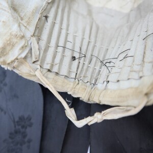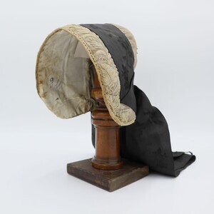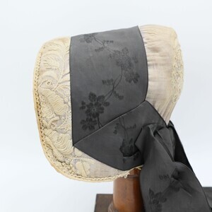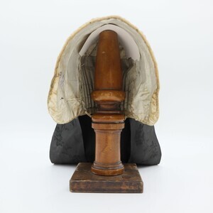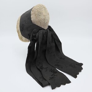 Trachtenhaube aus violettem Papier mit feiner weißer Baumwolle überzogen, gefüttert mit gestärktem weißem Leinen. Der Deckel und Rand der Krempe sind mit floralen Elementen bestickt (Stielstich, Füllstich). Um die Haube herum wurde ein schwarzes Seidenband mit floralem Muster angebracht das hinten zusammenläuft und von dort in zwei Schlaufen und zwei Bändern herunterhängt, diese wurden wahrscheinlich zur Trauer dazugefügt. Der Rand der Krempe endet in einem naturfarbenen Paspel mit dekorativer Zickzackborte in gleicher Farbe daneben. Innen ist rechts ist mit Kopierstift "3M" vermerkt (nicht original). Im Deckel wurden innen zur Verstärkung ein Stück Pappe und handbeschriebenes Papier eingesetzt, auf letzterem ist die Jahreszahl 1860 zu erkennen (Es handelt sich wahrscheinlich um einen Brief).