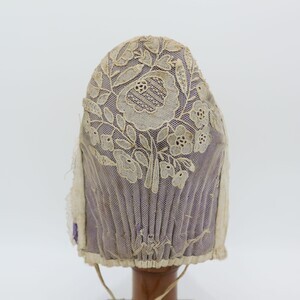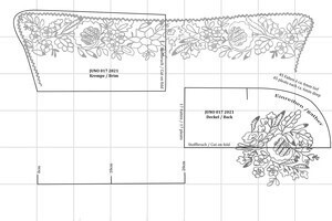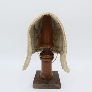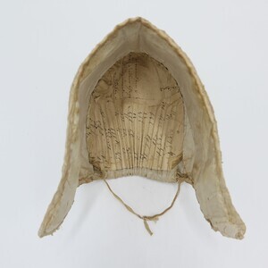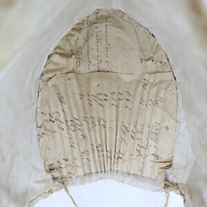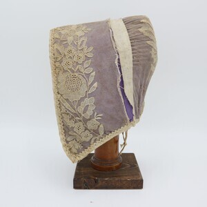 Trachtenhaube aus violettem Papier mit Bobinet (feiner netzartiger Stoff aus Baumwolle) überzogen, gefüttert mit gesteiftem weißem Leinen. Auf Deckel und Rand der Krempe sind florale Elemente aus feinem Baumwollstoff appliziert und umstickt. Der Rand der Krempe ist mit in einem naturfarbenen Band eingefasst auf dessen innerer Kante eine dekorative Zickzackborte in gleicher Farbe aufgenäht wurde. Im Deckel wurde innen zur Verstärkung ein Papier eingenäht, auf dem unteren sind Mathematikaufgaben zu erkennen. Das Band, das die Ansatznaht zwischen Krempe und Deckel bedeck,t ist nur lose angenäht und an der vorderen Seite nicht umgenäht, sodass sich einzelne Fäden lösen. Vermutlich ist diese Stelle nur unsauber verarbeitet worden weil sie die meiste Zeit von einem Seidenband verdeckt wurde. Die Stelle wo sich dieses früher befand ist weniger stark verblichen als der Rest der Haube. Den Fotos ist ein Schnittmuster zugefügt.