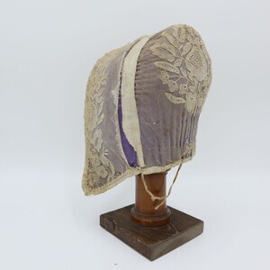 Trachtenhaube aus violettem Papier mit Bobinet (feiner netzartiger Stoff aus Baumwolle) überzogen, gefüttert mit gesteiftem weißem Leinen. Auf Deckel und Rand der Krempe sind florale Elemente aus feinem Baumwollstoff appliziert und umstickt. Der Rand der Krempe ist mit in einem naturfarbenen Band eingefasst auf dessen innerer Kante eine dekorative Zickzackborte in gleicher Farbe aufgenäht wurde. Im Deckel wurde innen zur Verstärkung ein Papier eingenäht, auf dem unteren sind Mathematikaufgaben zu erkennen. Das Band, das die Ansatznaht zwischen Krempe und Deckel bedeck,t ist nur lose angenäht und an der vorderen Seite nicht umgenäht, sodass sich einzelne Fäden lösen. Vermutlich ist diese Stelle nur unsauber verarbeitet worden weil sie die meiste Zeit von einem Seidenband verdeckt wurde. Die Stelle wo sich dieses früher befand ist weniger stark verblichen als der Rest der Haube. Den Fotos ist ein Schnittmuster zugefügt.