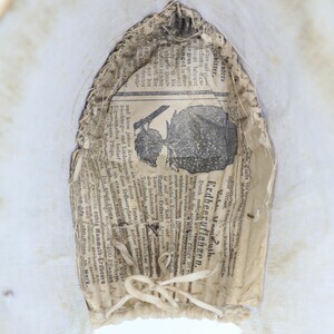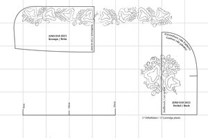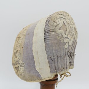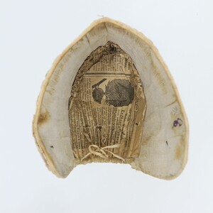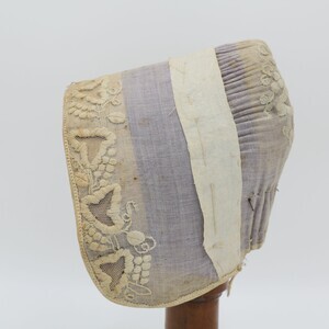Trachtenhaube aus violettem Papier mit Bobinet (feiner netzartiger Stoff aus Baumwolle) überzogen, gefüttert mit gesteiftem weißem Leinen. Der Deckel und Rand der Krempe sind dekoriert mit Stickerei in Form von Weinreben, daraus lässt sich schließen dass die Haube vermutlich aus einem Weinort kommt und den Stolz der Bewohner auf ihre regionale Spezialität ausdrückt. Der Rand der Krempe ist mit in einem naturfarbenen Band eingefasst auf dessen innerer Kante eine dekorative Zickzackborte in gleicher Farbe aufgenäht wurde. Im Deckel wurde innen zur Verstärkung Zeitungspapier eingenäht auf dem ein Artikel über Erdbeeren zu erkennen ist. Das Band das die Ansatznaht zwischen Krempe und Deckel bedeckt ist nur lose angenäht und an der vorderen Seite nicht umgenäht sodass sich einzelne Fäden lösen. Vermutlich ist diese Stelle nur unsauber verarbeitet worden weil sie die meiste Zeit von einem Seidenband verdeckt wurde. Die Stelle wo sich dieses früher befand ist weniger stark verblichen als der Rest der Haube. Innen links wurde mit Kopierstift eine "9" vermerkt. Den Fotos ist ein Schnittmuster zugefügt.