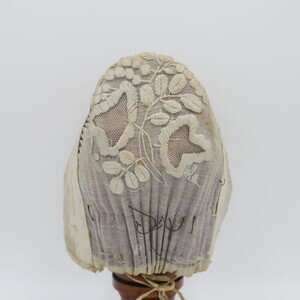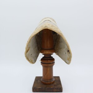 Trachtenhaube aus violettem Papier mit Bobinet (feiner netzartiger Stoff aus Baumwolle) überzogen, gefüttert mit gesteiftem weißem Leinen. Der Deckel und Rand der Krempe sind dekoriert mit Stickerei in Form von Weinreben, daraus lässt sich schließen dass die Haube vermutlich aus einem Weinort kommt und den Stolz der Bewohner auf ihre regionale Spezialität ausdrückt. Der Rand der Krempe ist mit in einem naturfarbenen Band eingefasst auf dessen innerer Kante eine dekorative Zickzackborte in gleicher Farbe aufgenäht wurde. Im Deckel wurde innen zur Verstärkung Zeitungspapier eingenäht auf dem ein Artikel über Erdbeeren zu erkennen ist. Das Band das die Ansatznaht zwischen Krempe und Deckel bedeckt ist nur lose angenäht und an der vorderen Seite nicht umgenäht sodass sich einzelne Fäden lösen. Vermutlich ist diese Stelle nur unsauber verarbeitet worden weil sie die meiste Zeit von einem Seidenband verdeckt wurde. Die Stelle wo sich dieses früher befand ist weniger stark verblichen als der Rest der Haube. Innen links wurde mit Kopierstift eine "9" vermerkt. Den Fotos ist ein Schnittmuster zugefügt.