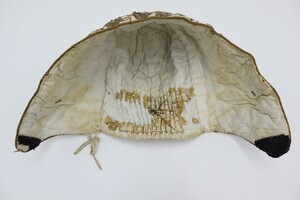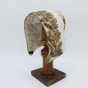 "Boak" der Eifelregion mit goldener Stickerei aus Metallfaden (Plattstich) und Pailletten. Die Haube besteht aus feinem weißem Leinen das im Schachbrettmuster gesteppt wurde, am Rand sind die Stiche enger beieinander. Sie ist mit grobem Leinen gefüttert. Der vordere Rand der Haube wird durch eine goldene Kordel abgeschlossen. Im inneren des Deckels sind Reste von Zeitungspapier zu finden das sich mit der Zeit herausgelöst haben muss, ursprünglich war der Ganze Deckel damit verstärkt. Des weiteren sind an den unteren Enden Stücke schwarzen Bandes angenäht die wohl nie richtig abgetrennt wurden sondern nur grob abgeschnitten um die Bindebänder zu entfernen.