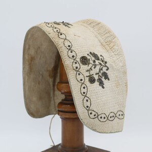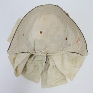 "Boak" der Eifelregion mit goldener Stickerei aus Metallfaden (Plattstich) und Pailletten. Die Haube besteht aus feinem weißem Leinen das im Schachbrettmuster gesteppt wurde, am Rand sind die Stiche enger beieinander. Sie ist mit grobem Leinen gefüttert. Der vordere Rand der Haube wird durch eine Kordel abgeschlossen. Obenherüber wurde ein cremefarbenes Seidenband angebracht das hinten in einer Schleife mit sechs Schlaufen endet.