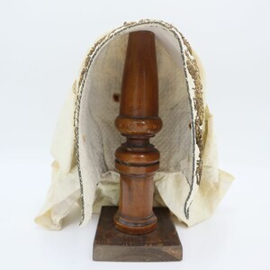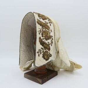 Wattierte Weiße Trachtenhaube mit Goldener Bouillonstickerei und Cremefarbenen Bändern