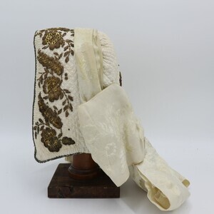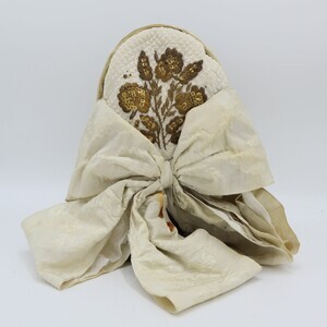 Wattierte Weiße Trachtenhaube mit Goldener Bouillonstickerei und Cremefarbenen Bändern