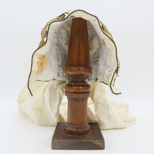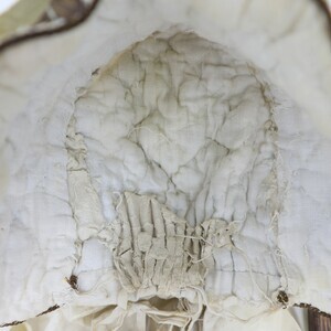 "Boak" der Eifelregion mit brauner (original vermutlich goldener) Stickerei aus Metallfaden (Plattstich) und Pailletten. Die Haube besteht aus feinem weißem Leinen das im Schachbrettmuster gesteppt wurde. Sie ist mit grobem Leinen gefüttert. Der vordere Rand der Haube wird durch eine Kordel abgeschlossen. Obenherüber wurde ein cremefarbenes Seidenband angebracht das hinten zu einer Schleife zusammengeführt ist und von dort in zwei Schlaufen und zwei Bändern herunterhängt. Im inneren des Deckels sind Papierreste zu finden die sich mit der Zeit herausgelöst haben, ursprünglich war der Ganze Deckel damit verstärkt.