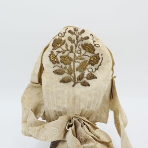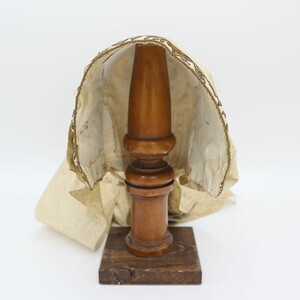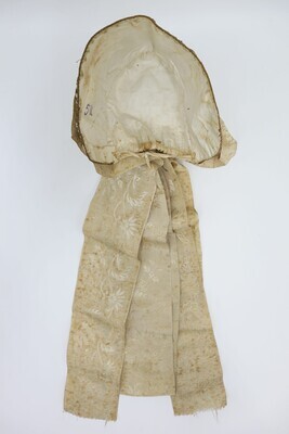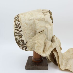 Weiße Trachtenhaube aus Leinen mit floraler goldener Bouillonstickerei und Pailetten. Die Kante der Krempe ist mit einer goldenen Kordel verziert. Die Haube ist mit grobem weißen Leinen gefüttert, rechts ist mit Kopierstift im Nachhinein "5M" vermerkt worden. Ursprünglich war im Deckel zur verstärkung Papier eingenäht, dieses wurde jedoch entfernt sodass nur noch ein winziger Rest und die Spuren der Sriche zu sehen sind. Obenherüber wurde ein creme/goldfarbenes Seidenband angebracht das hinten zusammengeführt ist und von dort in zwei Schlaufen und zwei Bändern herunterhängt.