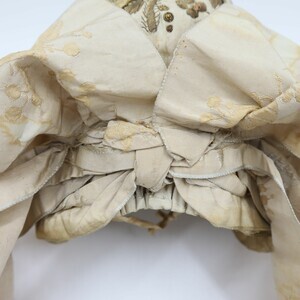Weiße Trachtenhaube aus Leinen mit floraler goldener Bouillonstickerei und Pailetten. Die Kante der Krempe ist mit einer goldenen Kordel verziert. Die Haube ist mit grobem weißen Leinen gefüttert, rechts ist mit Kopierstift im Nachhinein "5M" vermerkt worden. Ursprünglich war im Deckel zur verstärkung Papier eingenäht, dieses wurde jedoch entfernt sodass nur noch ein winziger Rest und die Spuren der Sriche zu sehen sind. Obenherüber wurde ein creme/goldfarbenes Seidenband angebracht das hinten zusammengeführt ist und von dort in zwei Schlaufen und zwei Bändern herunterhängt.