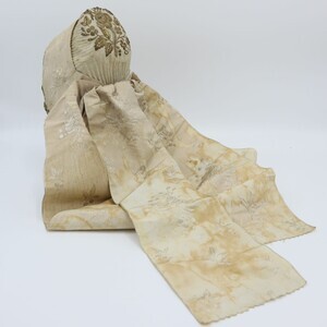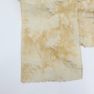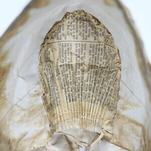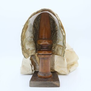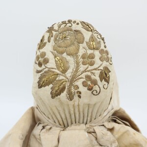 Weiße Trachtenhaube aus Leinen mit floraler goldener Stickerei und Pailetten. Die Stickerei ist größtenteils als Plattstick ausgeführt mit Bouillonstickerei für einzelne Akzente. Eine goldene Kordel ziert die Kante der Krempe. Die Haube ist mit grobem weißen Leinen gefüttert, im Deckel wurde innen zur Verstärkung Papier einer Zeitung (Teil eines Fortsetzungsromans) eingenäht. Obenherüber wurde ein creme/goldfarbenes Seidenband angebracht das hinten zu einer Schlaufe zusammengeführt ist und von dort in zwei Schlaufen und zwei Bändern herunterhängt.