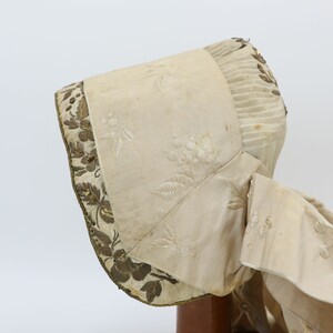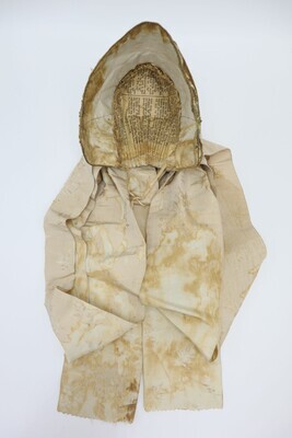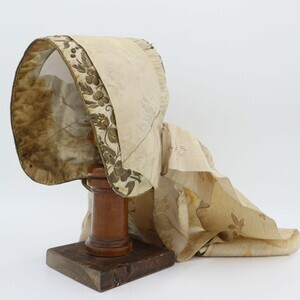 Weiße Trachtenhaube aus Leinen mit floraler goldener Stickerei und Pailetten. Die Stickerei ist größtenteils als Plattstick ausgeführt mit Bouillonstickerei für einzelne Akzente. Eine goldene Kordel ziert die Kante der Krempe. Die Haube ist mit grobem weißen Leinen gefüttert, im Deckel wurde innen zur Verstärkung Papier einer Zeitung (Teil eines Fortsetzungsromans) eingenäht. Obenherüber wurde ein creme/goldfarbenes Seidenband angebracht das hinten zu einer Schlaufe zusammengeführt ist und von dort in zwei Schlaufen und zwei Bändern herunterhängt.