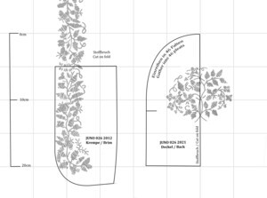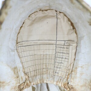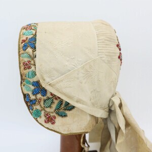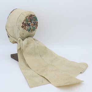 Weiße Trachtenhaube aus Leinen mit floraler Stickerei aus Perlen in Gold, Blau-, und Rottönen. Die Kante der Krempe ist mit einer goldenen Kordel verziert. Die Haube wurde mit grobem weißen Leinen gefüttert, zur Verstärkung wurde im Deckel ein Stück Papier eingenäht. Obenherüber ist ein naturweißes Seidenband angebracht das hinten zu einer Schleife zusammengeführt ist und von dort in zwei Schlaufen und zwei Bändern herunterhängt.
